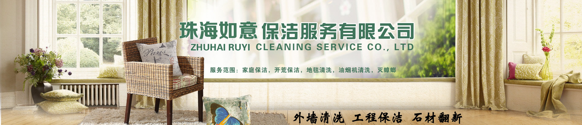 珠海市如意清潔主營:外墻清洗、地毯清洗、石材護理翻新、企業保潔、開荒清潔、屋面防水、油煙管道清洗。家庭保潔,物業保潔,小區物業保潔,樓盤開荒,沙發清潔,地板打蠟,(建筑、汽車玻璃貼膜)。